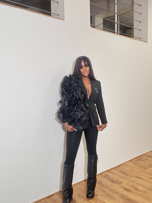 Blazer Noir Asymétrique avec Volants Spectaculaires
