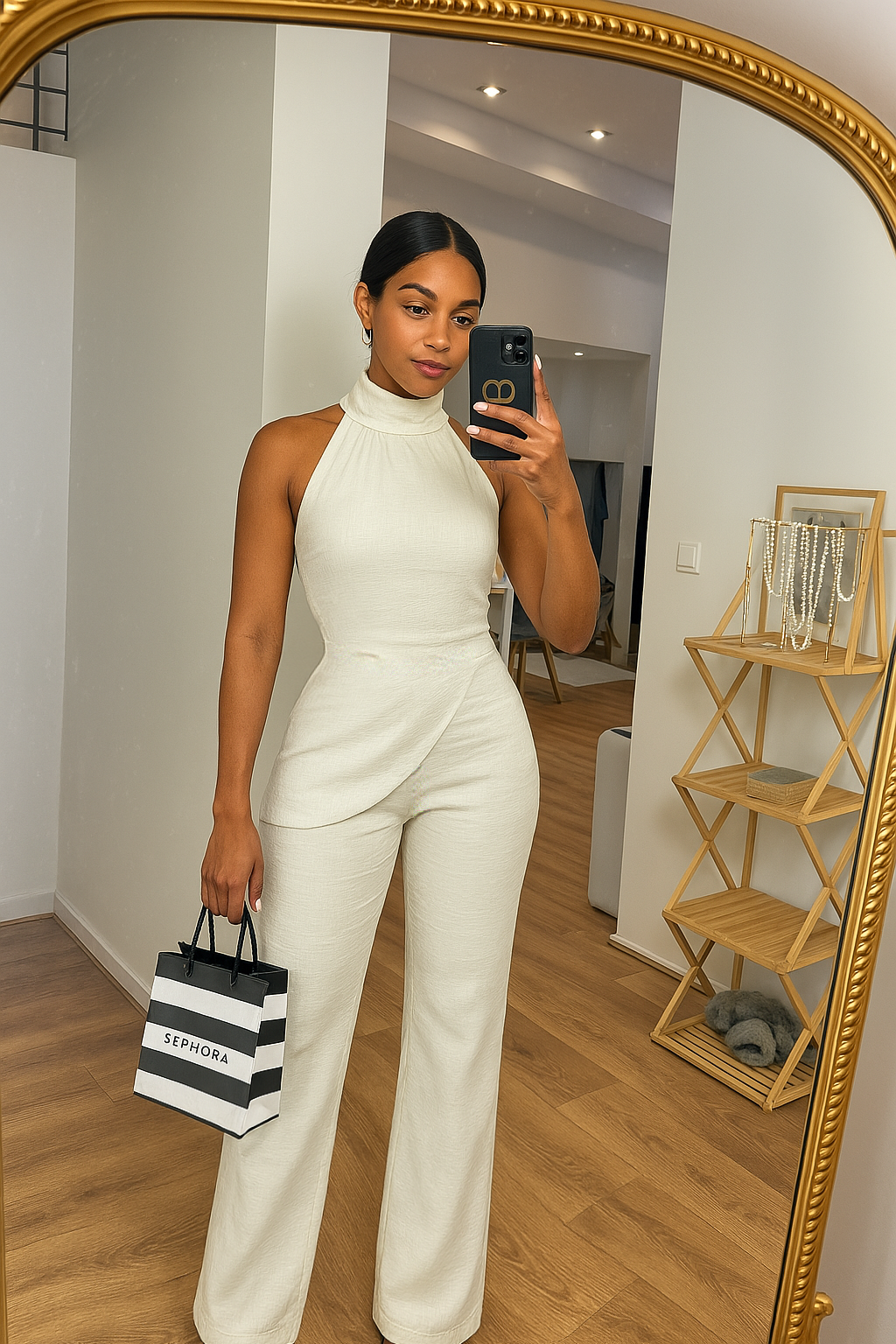 Craquez pour cet ensemble blanc ultra chic, parfait pour vos événements, soirées ou rendez-vous professionnels. Composé d’un haut asymétrique à col montant et d’un pantalon fluide façon lin, cet ensemble allie élégance, modernité et confort.
