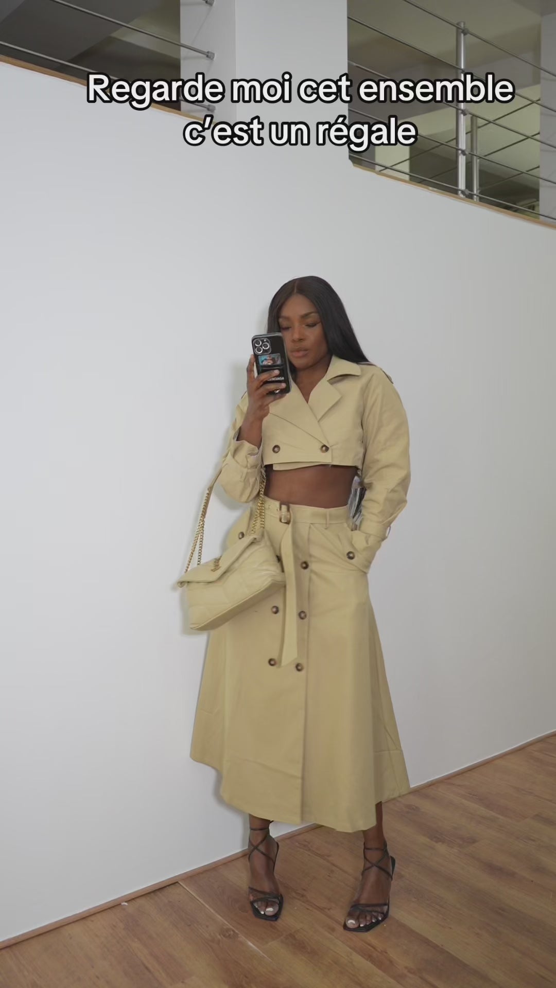 ✨ Revisitez le trench classique avec une touche moderne ! Cet ensemble se compose d’un trench cropped à double boutonnage et d’une jupe longue taille haute assortie. Son design structuré et sa coupe fluide apportent une allure chic et sophistiquée.