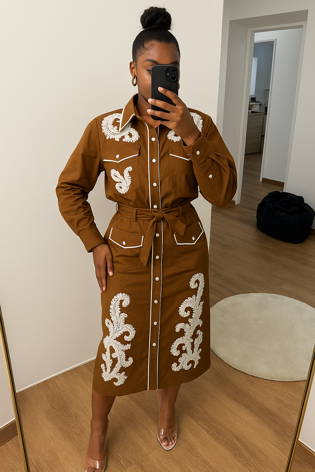 À associer avec des sandales à talons transparents ou des bottines western pour un look 100 % affirmé. Chignon haut et accessoires dorés recommandés !