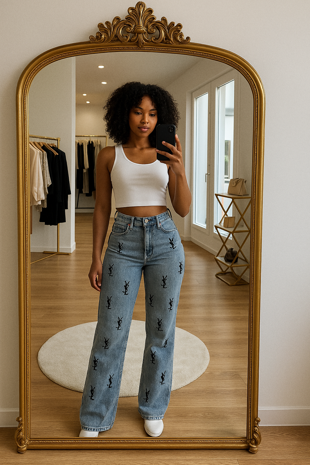Affiche ton style avec ce jean “Logo Chic”, une pièce forte et tendance à porter au quotidien.