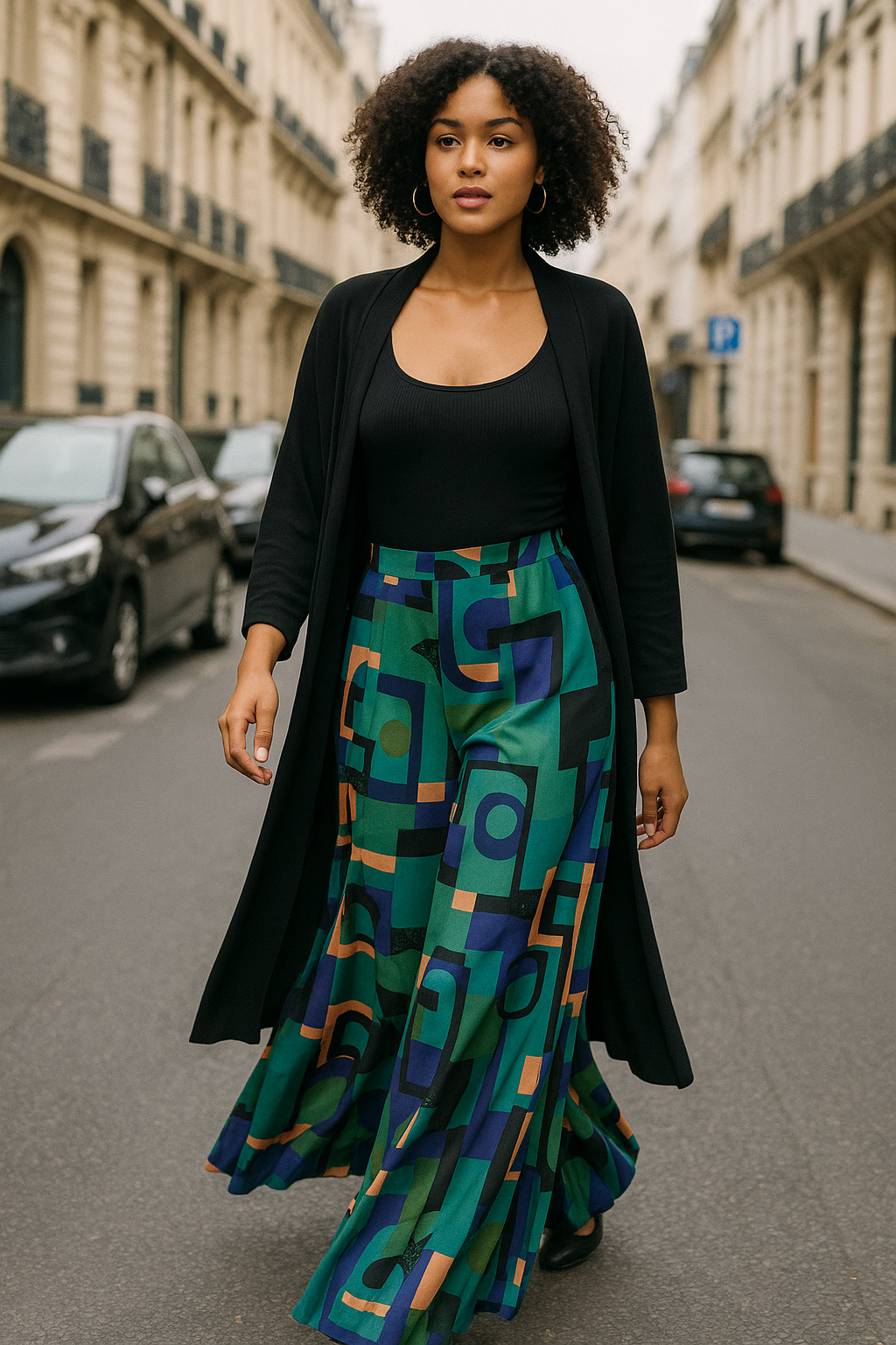 Faites sensation avec ce pantalon palazzo ultra-long à l’imprimé géométrique chic et audacieux. Sa coupe fluide et évasée allonge la silhouette et offre un confort absolu tout en restant résolument stylée. Confectionné dans une matière légère au tomber parfait, il convient idéalement aux femmes mesurant jusqu’à 1,75 m et plus.