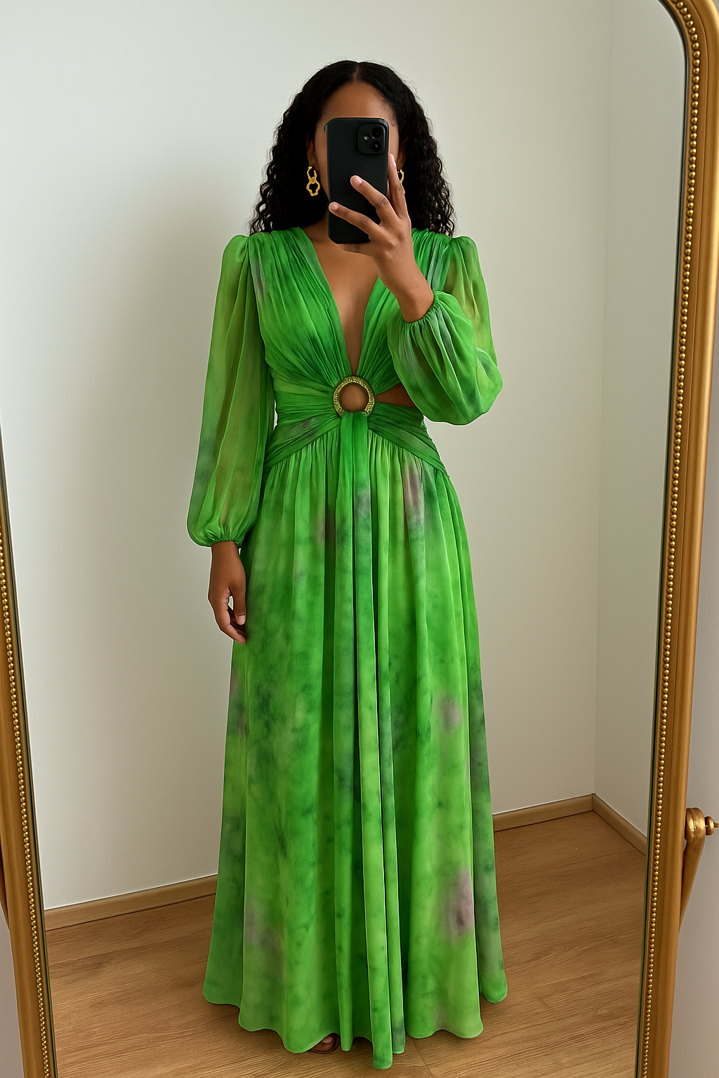 Laisse-toi séduire par cette robe longue fluide et élégante, aux nuances de vert émeraude et touches subtiles de violet. Son tissu vaporeux et sa coupe audacieuse avec découpe à la taille mettent en valeur la silhouette avec délicatesse.