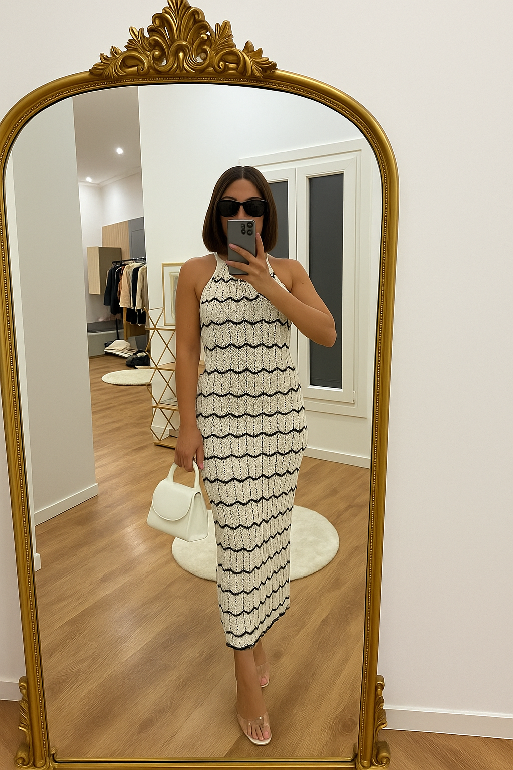 Cette robe longue en crochet est la pièce idéale pour un look élégant, estival et ultra tendance. Son motif zigzag noir sur fond crème apporte du relief tout en soulignant la silhouette avec douceur. Elle se porte aussi bien en journée avec des sandales qu’en soirée avec des escarpins.