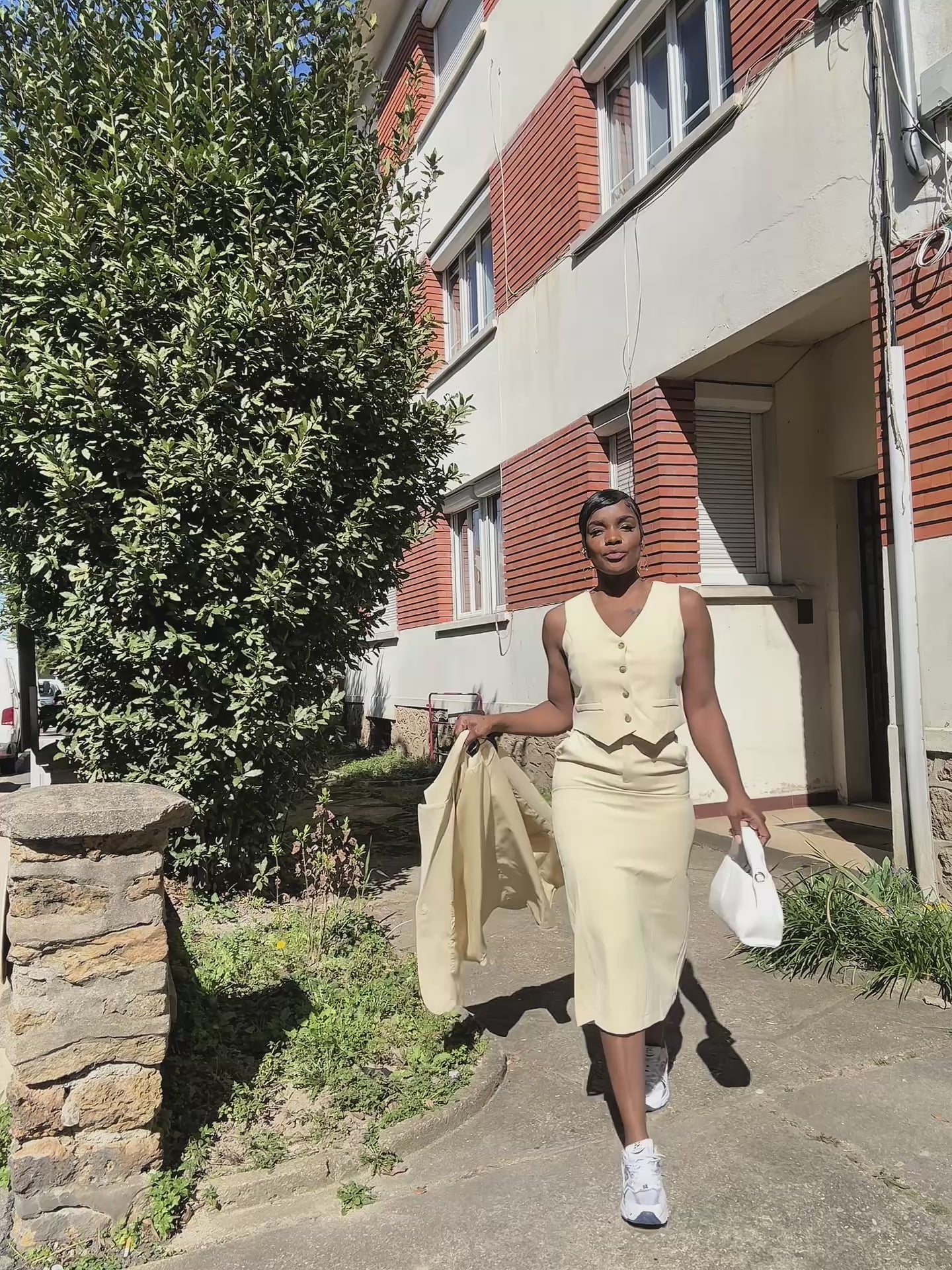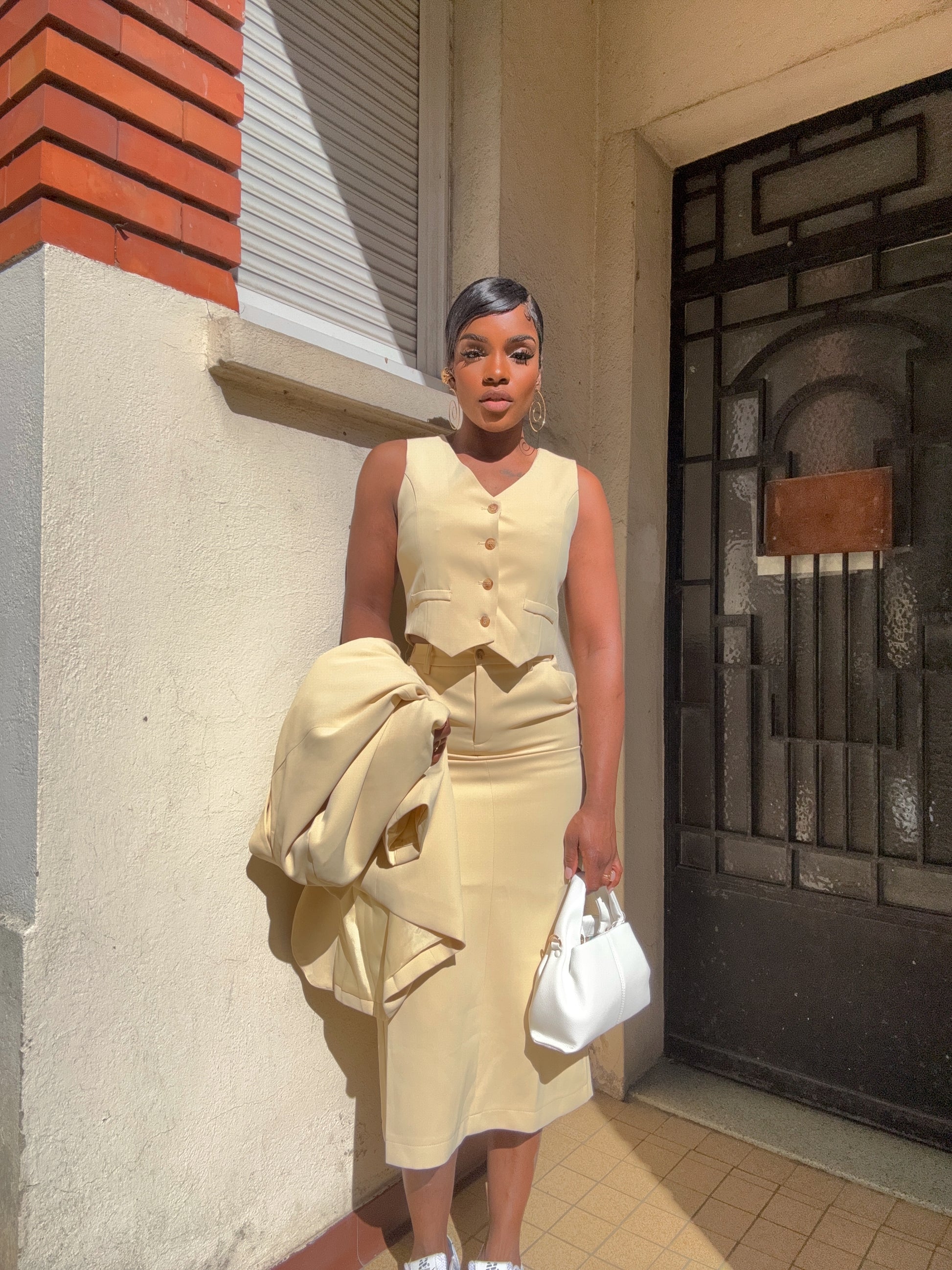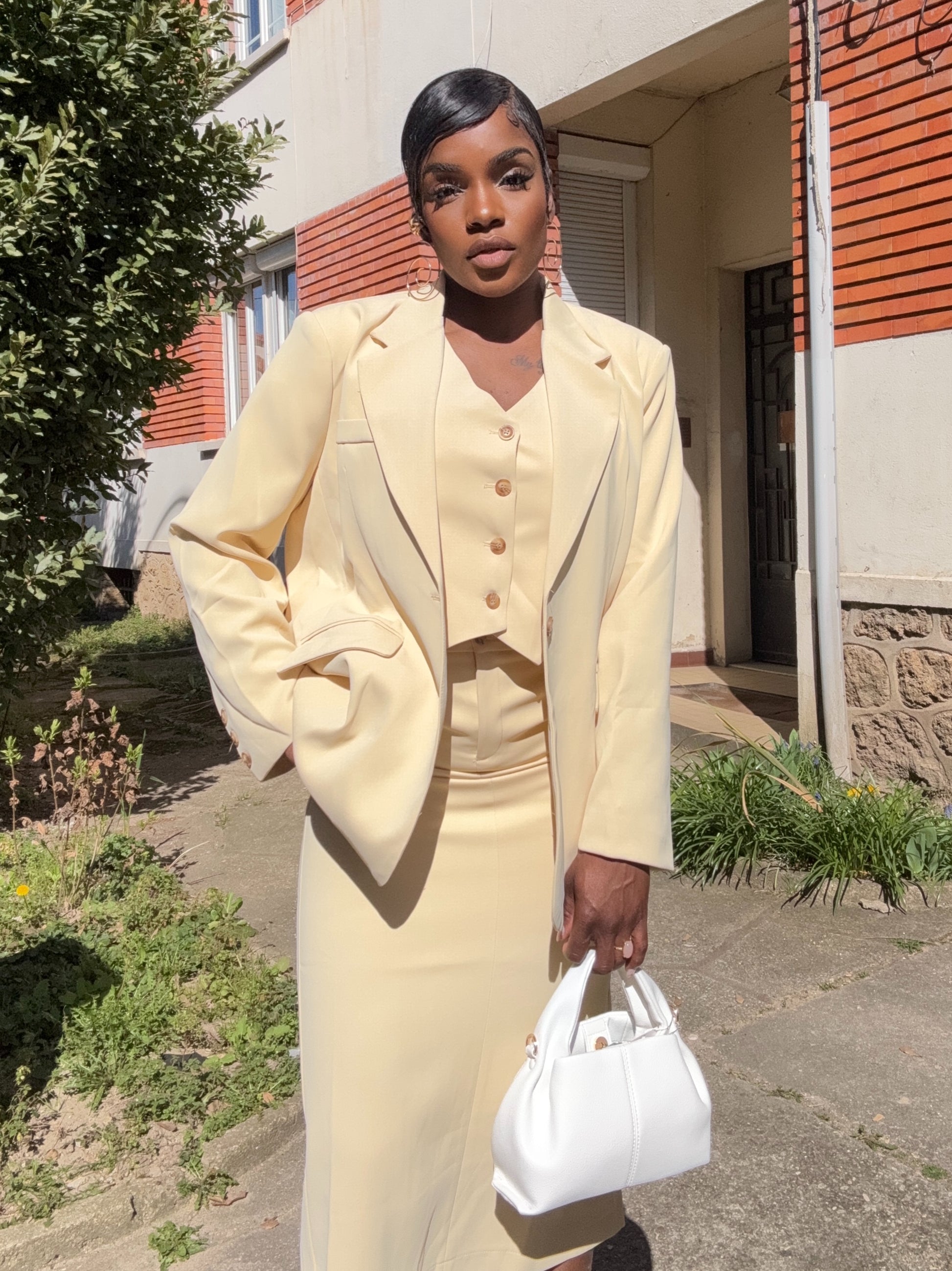 Laisse entrer la lumière avec notre tailleur trois pièces “Soleil Doux”, une tenue pleine de fraîcheur et d’élégance. Sa teinte jaune poussin illumine le teint et apporte une touche audacieuse tout en restant raffinée. Ce tailleur est idéal pour les femmes qui aiment allier sophistication et confort.