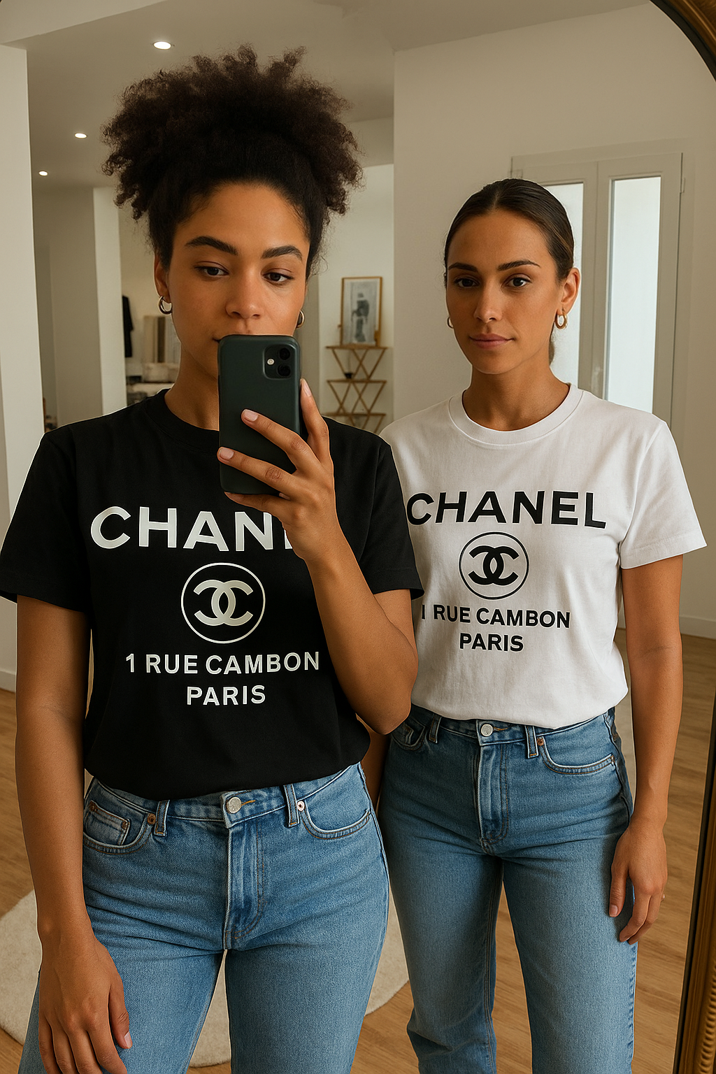 T-shirt iconique à l’esprit parisien, orné de l’inscription “CHANEL 1 RUE CAMBON PARIS”. Coupe droite, col rond, en coton doux. À porter aussi bien en mode casual qu’ultra chic.